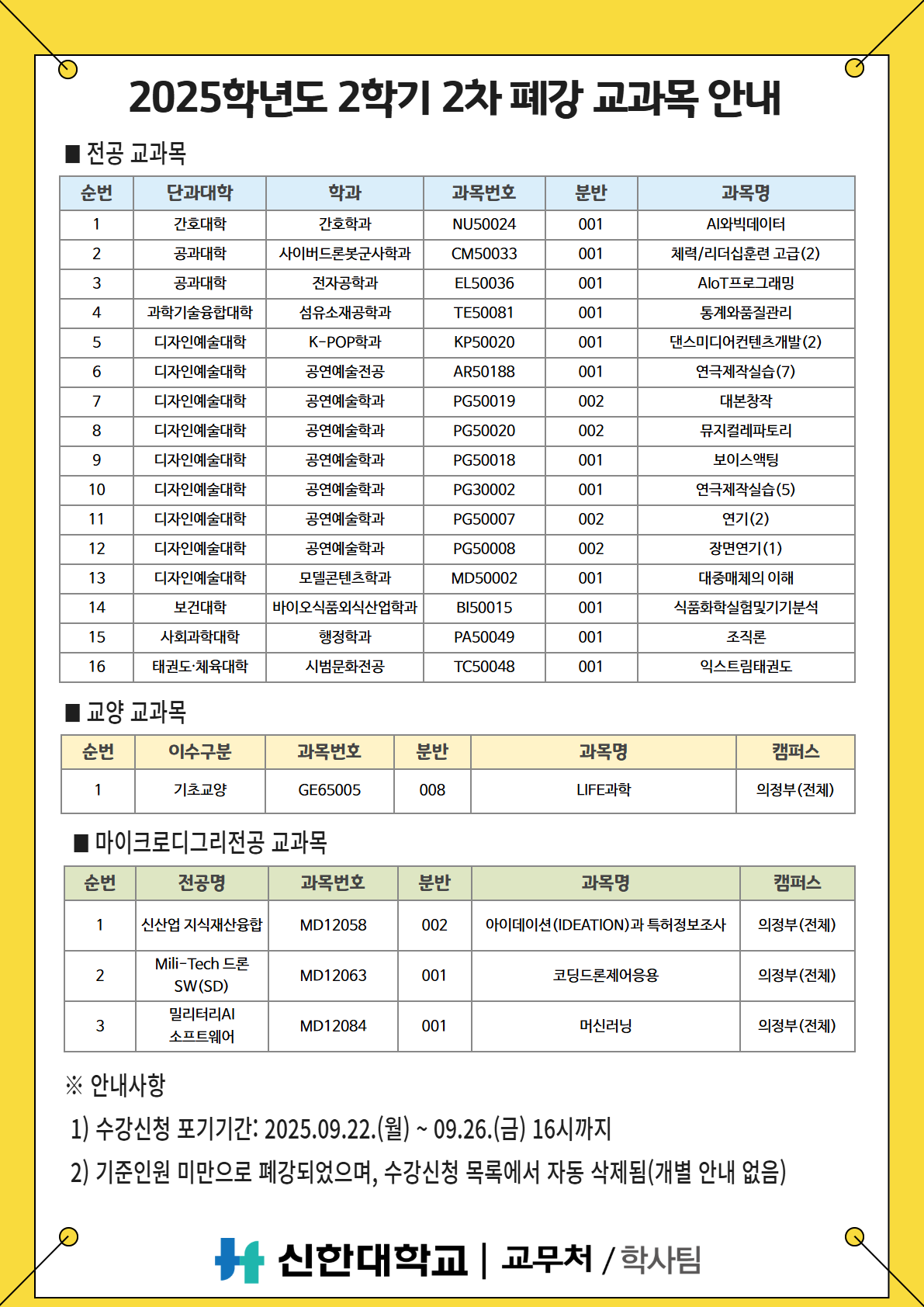[학사팀/수업] 2025학년도 2학기 2차 폐강 교과목 안내